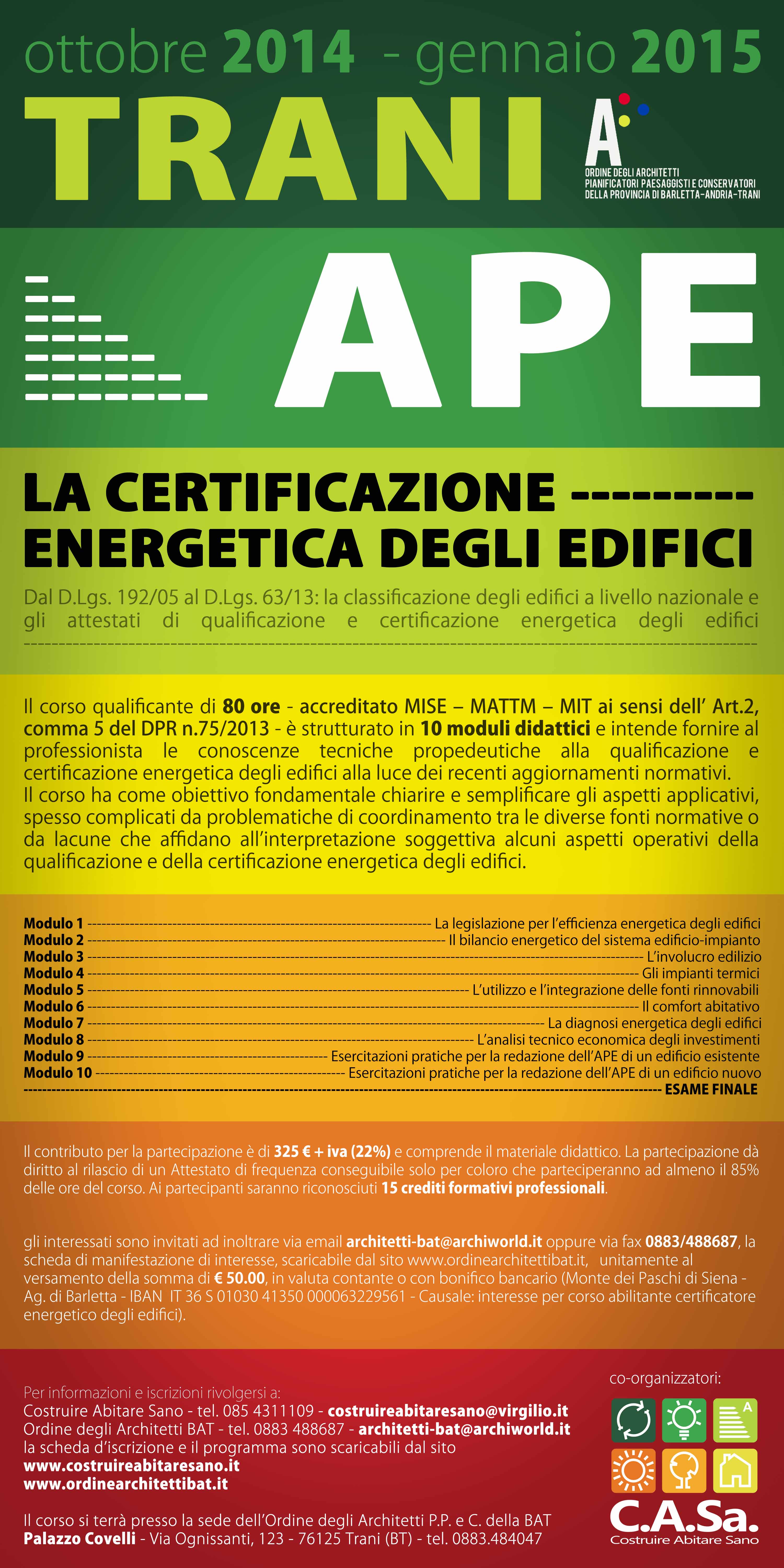 Nasce dalla collaborazione tra la L’ordine degli Architetti della Provincia di Barletta Andria Trani e C.A.Sa. Costruire Abitare Sano, il percorso formativo qualificante per certificatori energetici degli edifici ai sensi del DPR 75/13 (autorizzazione richiesta al MISE) che si svolgerà a partire da fine ottobre a TRANI.