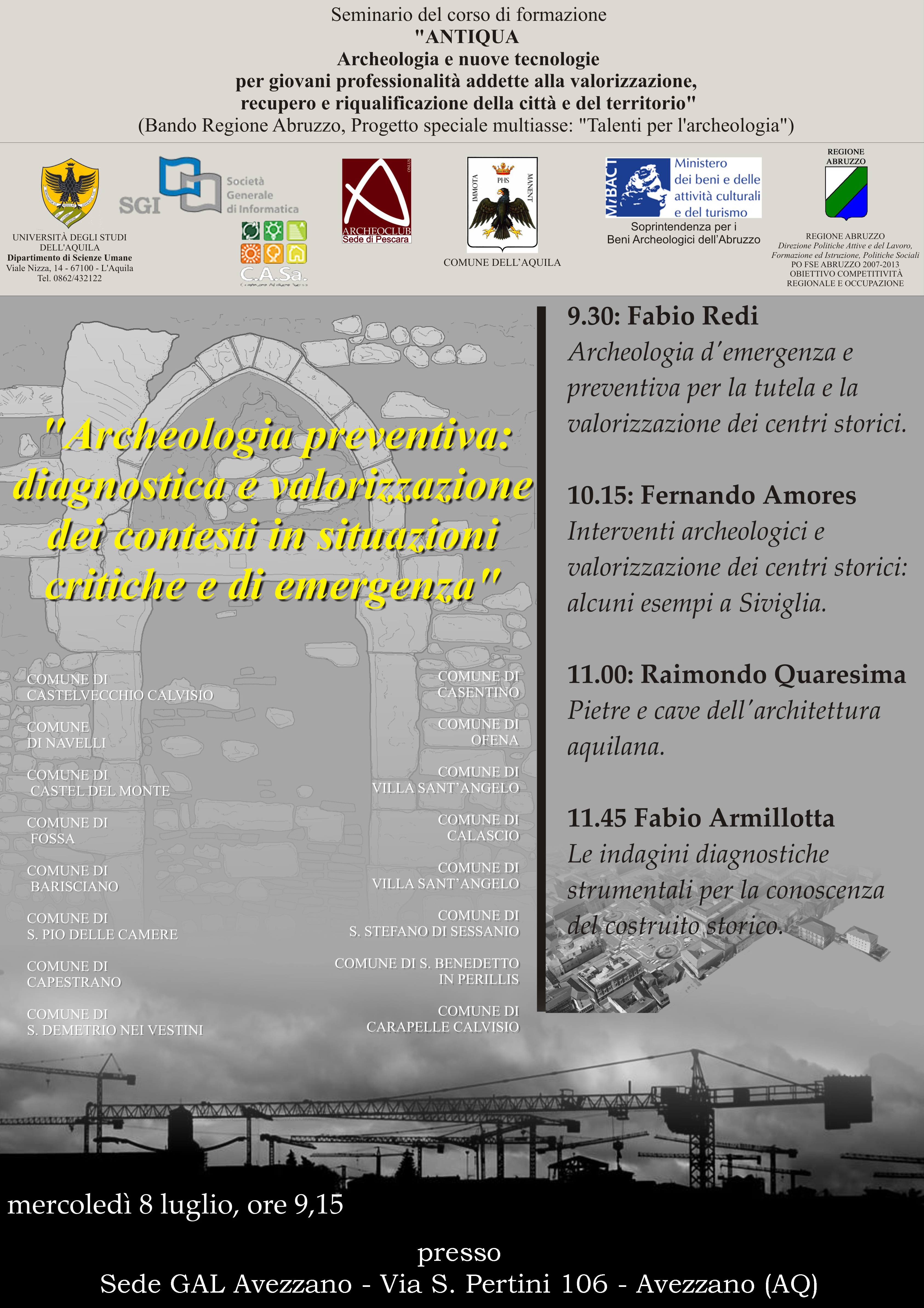 Mercoledì 8 luglio a partire dalle 9,15 si terrà presso la sede del GAL Gran Sasso Velino (Via Sandro Pertini 106 ad Avezzano) il seminario dal titolo “Archeologia preventiva: diagnostica e valorizzazione dei contesti in situazioni critiche e di emergenza”. Il convegno rientra nelle attività del progetto “Talenti per l’archeologia” dell’ATS “Antiqua” e avrà il seguente programma: